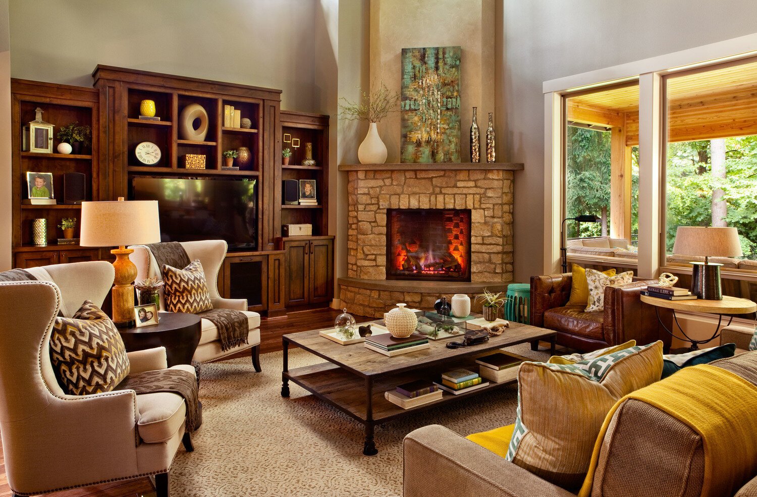 The fireplace is going to draw a lot of eyes since it’s at eye level. This means that whatever you have adorning your mantel is going to make a big impression on guests. Be honest and open and add a flair of your personality to this space. This can be done with a family portrait, a photo you took, a family heirloom, or something else unique, like a salt lamp or a handmade bowl.