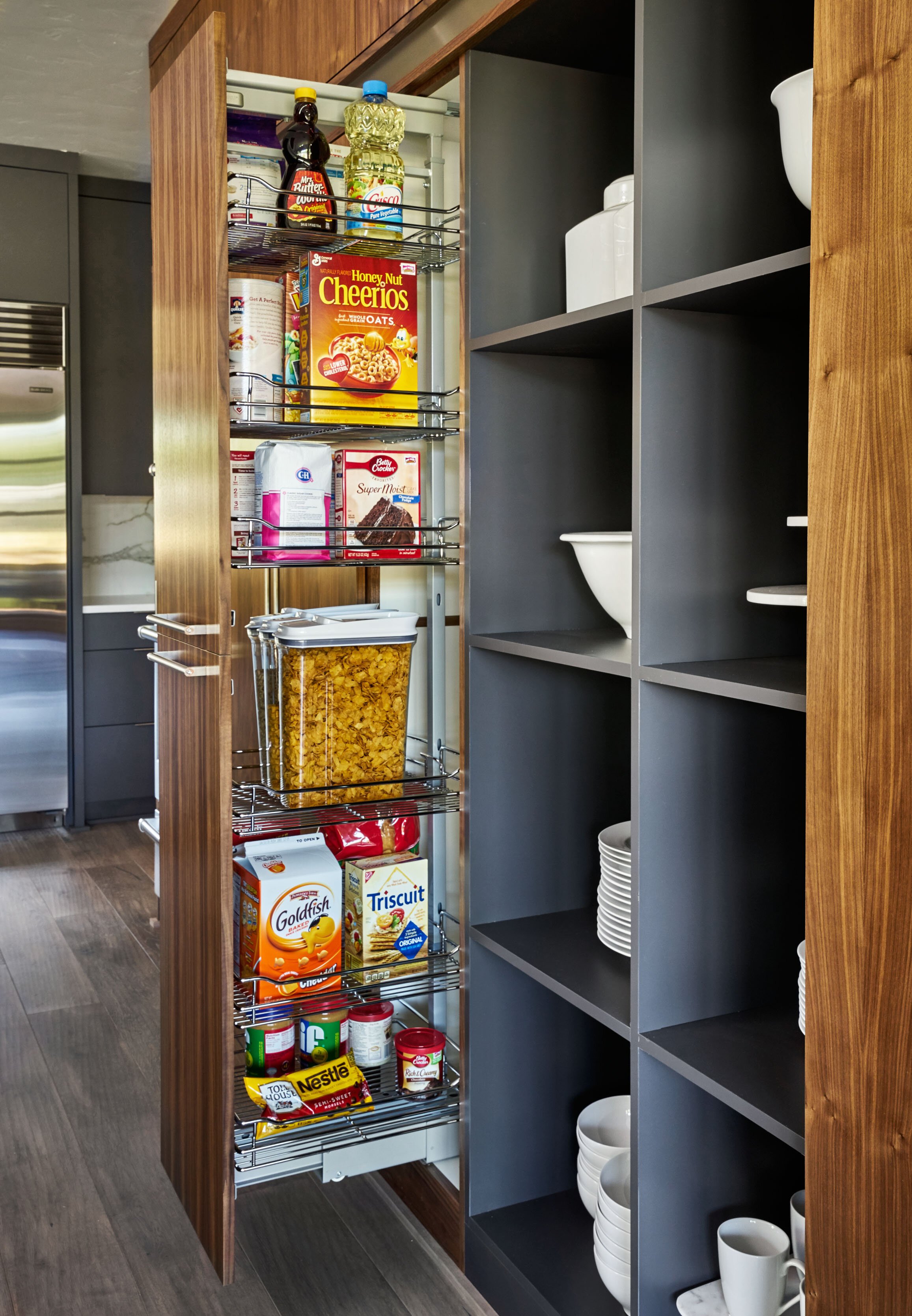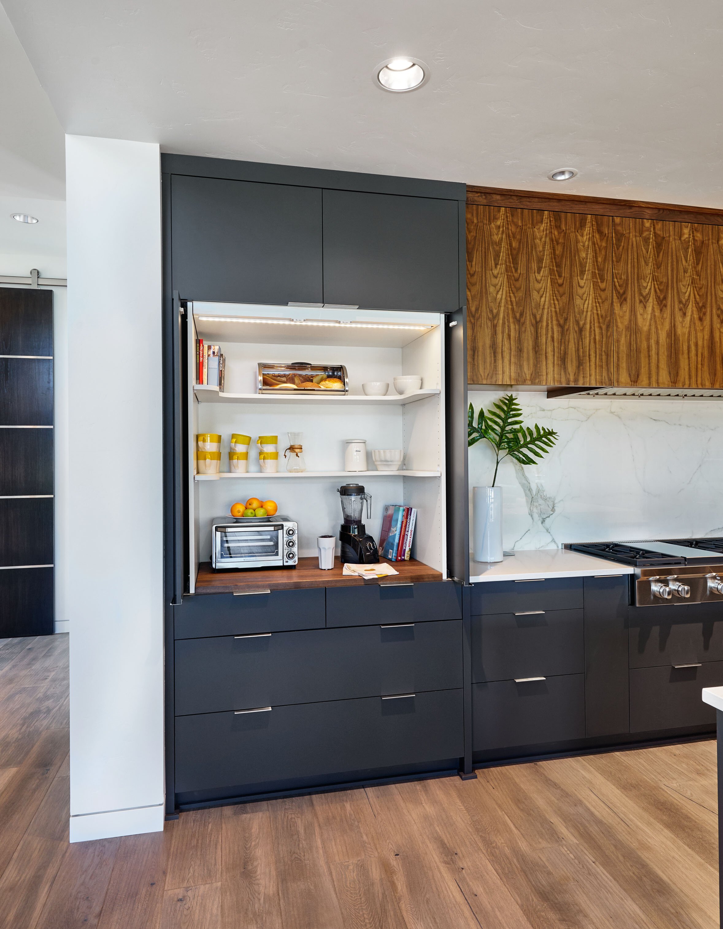 NW contemporary kitchen with gray laminate and walnut cabinetry. Double island configuration.
