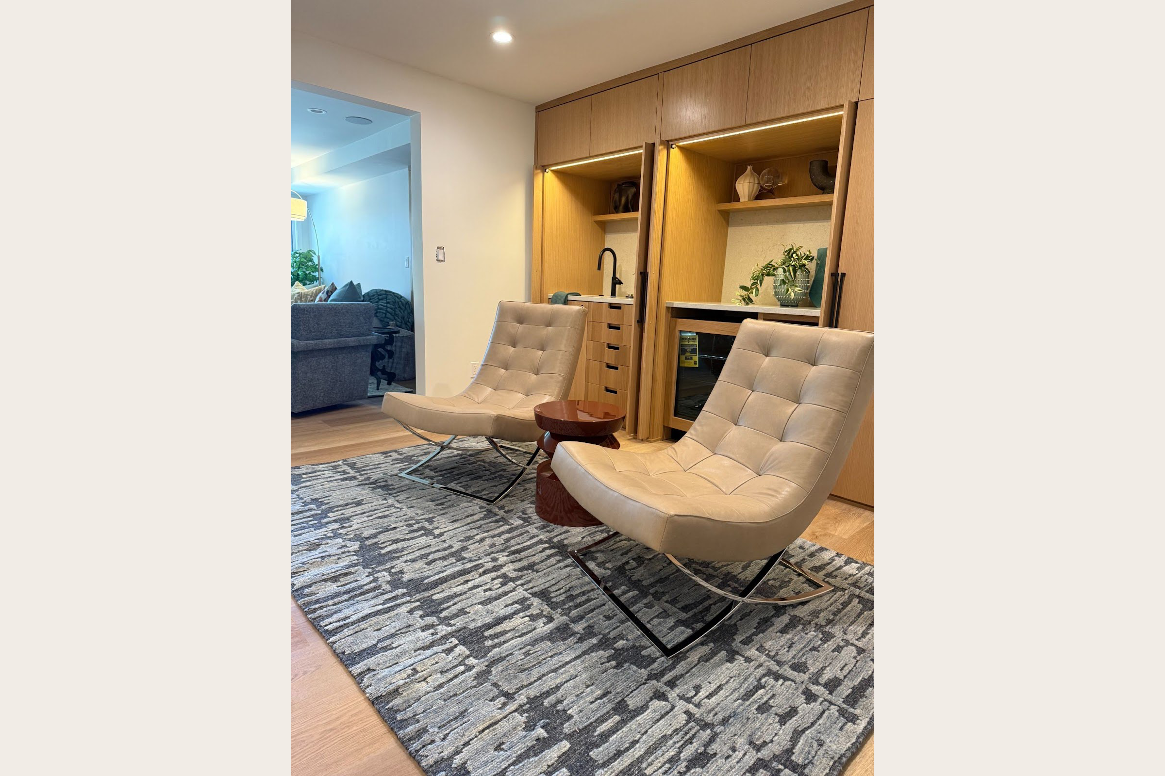 What We Did: Added hidden storage, optimized lighting, installed white oak cabinetry with dedicated sink/wine fridge zones and pocket doors.