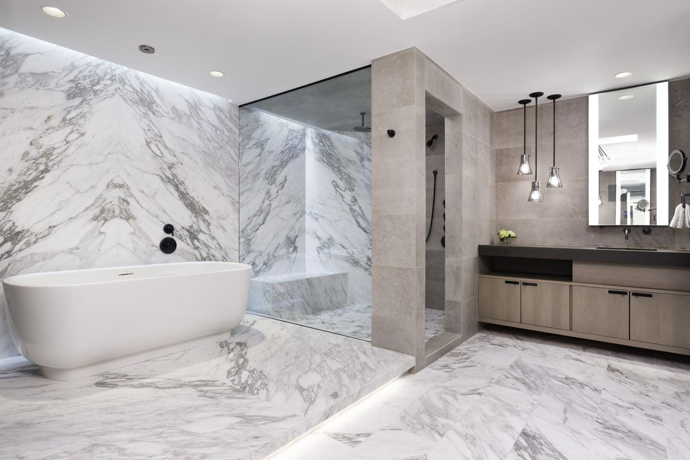 What We Did: Demolished walls, replaced travertine with Carrara marble slabs, added lit tub platform and ceiling-fill fixture.