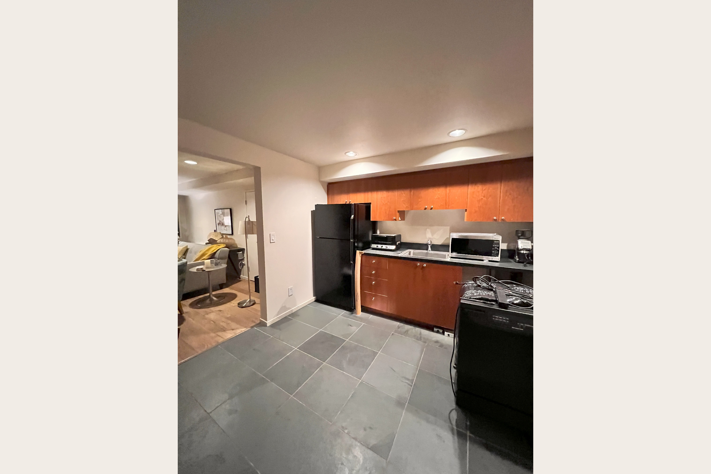 The Result: Dark kitchenette transformed into bright, versatile entertainment space with concealed storage.